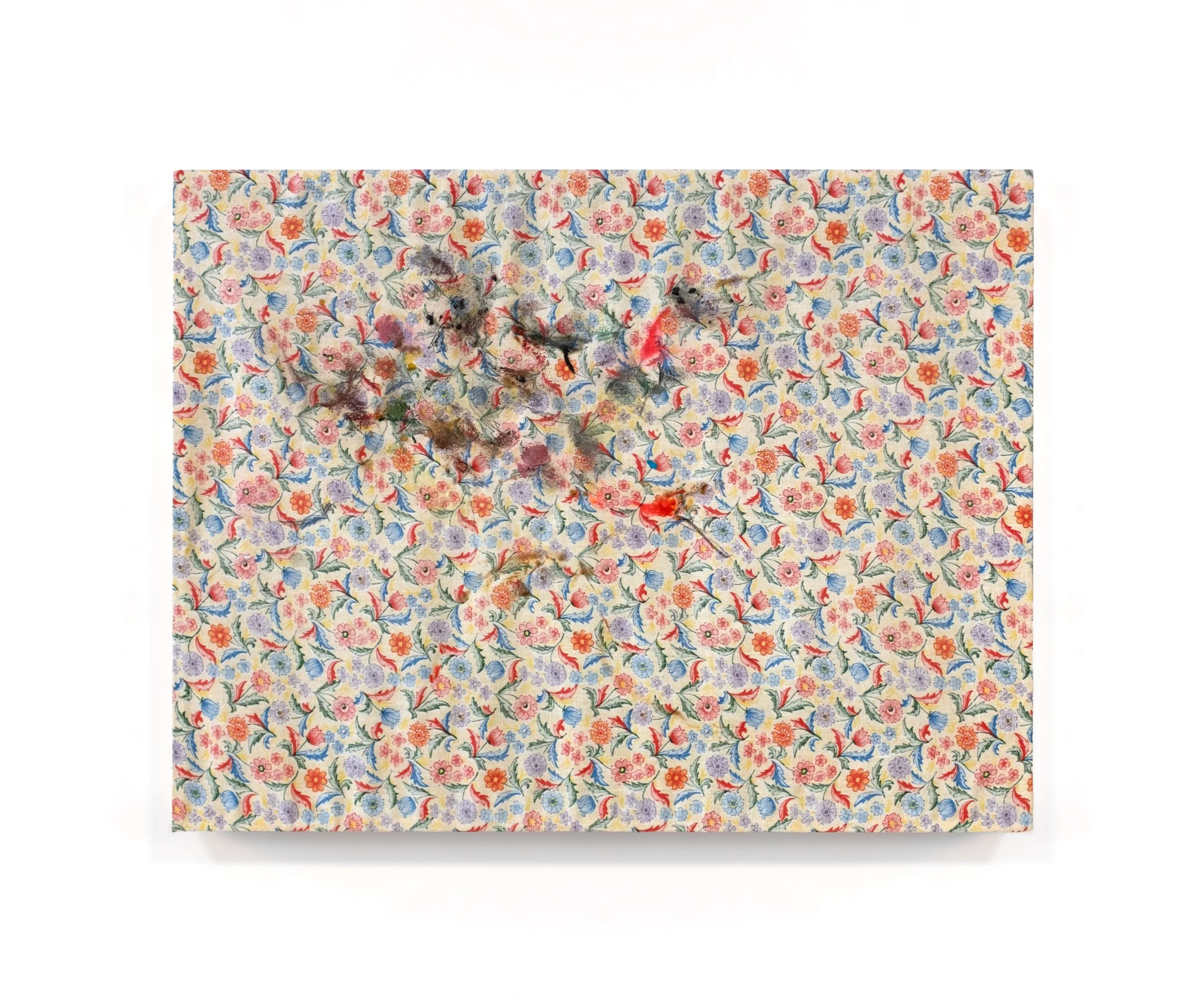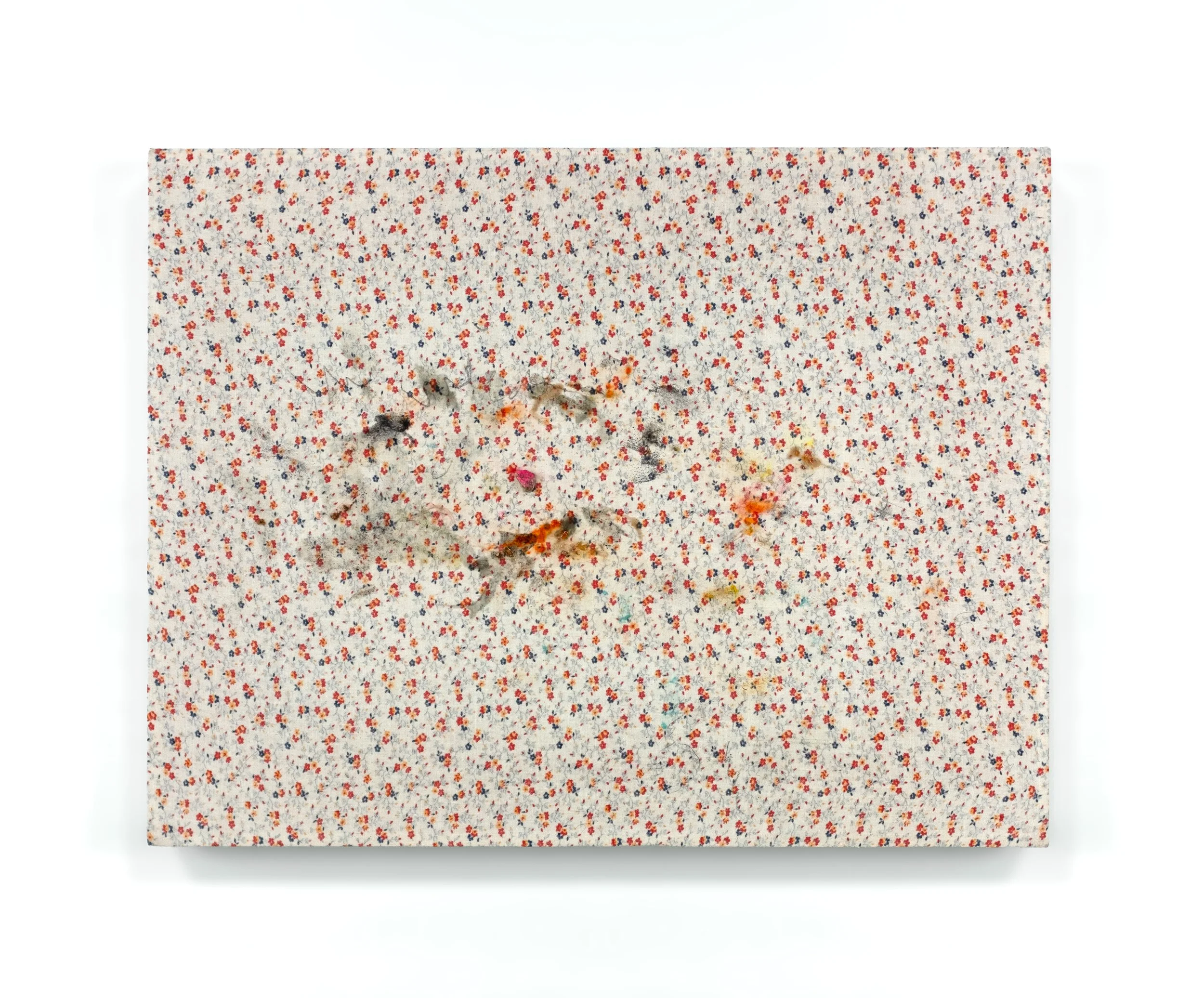 Tiffany & Co. jewelry bag, pink burlap, watercolor pencil, urethane, gel pen, graphite, car turn signal light bulb glass, Pacifico brand beer bottle, dirt taken from interior of Richard Serra sculpture Reading Cones, Cumbrian lake clay, Oxford ochre, raw sienna, transfer paper, colored pencil, red yarn, oil paint, brick, construction spray paint on sidewalk, PMC .308 Winchester 147-grain full metal jacket-boat tail rifle ammunition casing found in Chicago at West Armitage Avenue and Cicero Avenue, ballpoint pen on Calico fabric ca. 1960, 14 x 18 inches
