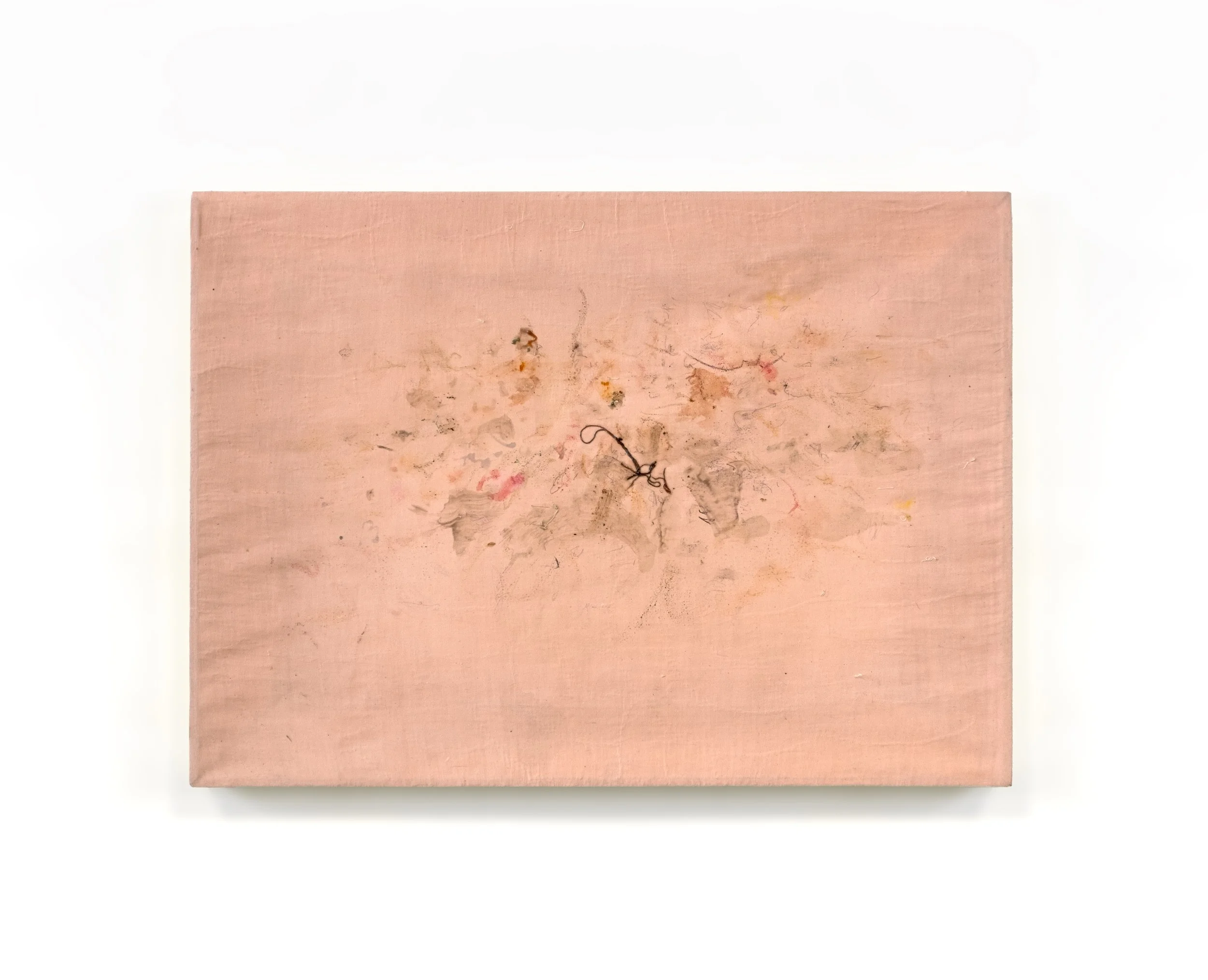 Flannel string, urethane, violet red Crayola crayon wrapper, turn signal light bulb glass, burlap shavings, strand of artist’s hair, natural pigments, watercolor, beeswax crayon, dirt, floor sweepings, graphite, colored pencil, conte crayon, pen, and oil paint on salvaged quilt backing fabric ca. 1930, 16 x 22 inches