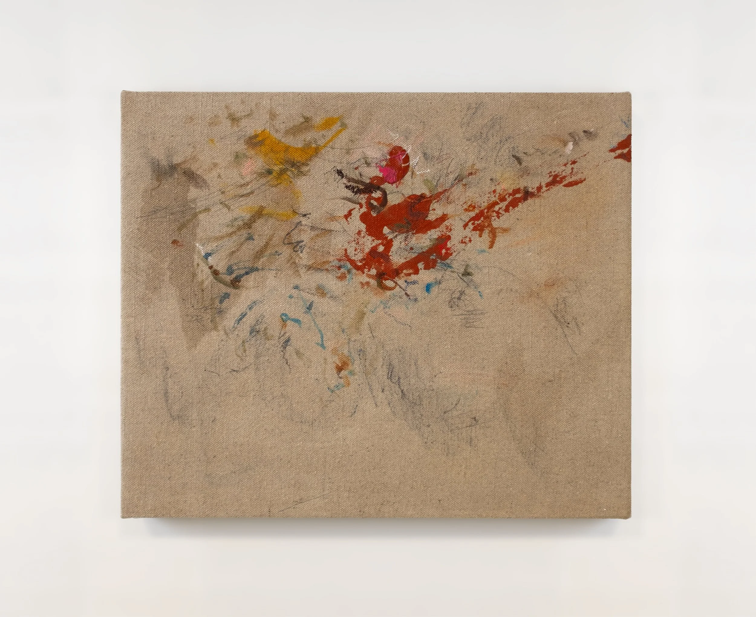 Acrylic paint, wax crayon, graphite, and oil paint on jute, 20 x 24 inches