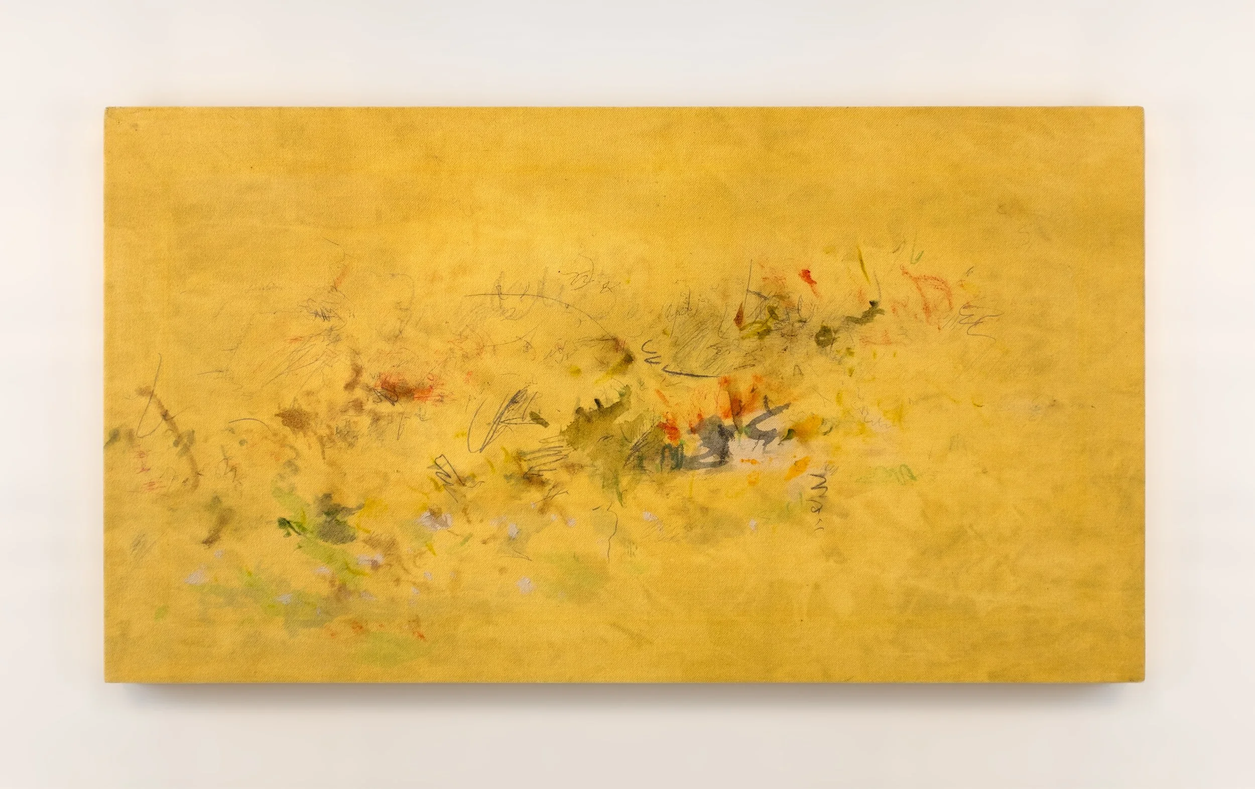 Acrylic paint, natural pigments, pen, wax crayon, conte crayon, graphite, and oil paint on linen, 36 x 48 inches